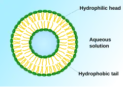 Liposomes are spherical vesicles composed of synthetic or natural phospholipids that self-assemble in aqueous solution in sizes ranging from tens of nanometers to micrometers.[16] The resulting vesicle, which has an aqueous core surrounded by a hydrophobic membrane, can be loaded with a wide variety of hydrophobic or hydrophilic molecules for therapeutic purposes.