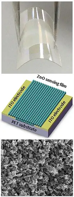 - ↑ Zheng, Z. Q.; et al. (2015). "Light-controlling, flexible and transparent ethanol gas sensor based on ZnO nanoparticles for wearable devices". Scientific Reports. 5: 11070. Bibcode:2015NatSR...511070Z. doi:10.1038/srep11070. PMC 4468465. PMID 26076705.