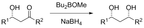 The Narasaka–Prasad reduction, sometimes simply called Narasaka reduction, is a diastereoselective reduction of β-hydroxy ketones to the corresponding syn-dialcohols. The reaction employs a boron chelating agent, such as BBu2OMe, and a reducing agent, commonly sodium borohydride. This protocol was first discovered by Narasaka in 1984.[1]