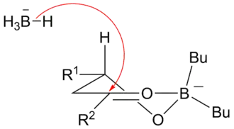 The reaction proceeds through the 6-membered transition state shown below. Chelation by the boron agent favors hydride delivery from the top face because it leads directly to the more stable chair-like conformation of the product (Fürst-Plattner Rule). The intermolecular hydride delivery from NaBH4 therefore proceeds via an axial attack from the opposite face with respect to the existing alcohol.[1]