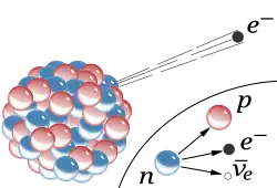 The inset shows beta decay of a free neutron; an electron and antineutrino are created in this process.