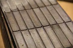 The active material of the negative plates is iron oxide. The retainer pockets are made of thin, finely perforated nickel-plated steel, of rectangular shape, 1/2 in. wide, 3 in long and 1/8 in. maximum thickness. The iron oxide, in finely powdered form is tightly rammed into these pockets, after which they are mounted into the grids. After mounting they are pressed, forcing them into close contact with the grids. This corrugates the sides of the pockets to provide a spring contact of the pocket with the active material.[18]