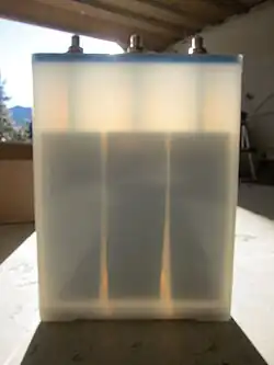 The open-circuit voltage is 1.4 volts, dropping to 1.2 volts during discharge.[7] The electrolyte mixture of potassium hydroxide and lithium hydroxide is not consumed in charging or discharging, so unlike a lead-acid battery the electrolyte specific gravity does not indicate state of charge.[7] The voltage required to charge the NiFe battery is equal to or greater than 1.6 volts per cell.[18] The inclusion of lithium hydroxide improves the performance of the cell. The equalization charge voltage is 1.65 volts.