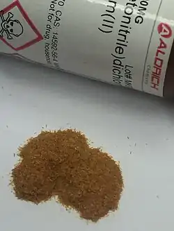 Nitriles are precursors to transition metal nitrile complexes, which are reagents and catalysts. Examples include tetrakis(acetonitrile)copper(I) hexafluorophosphate ([Cu(MeCN)4]+) and bis(benzonitrile)palladium dichloride (PdCl2(PhCN)2).[40]