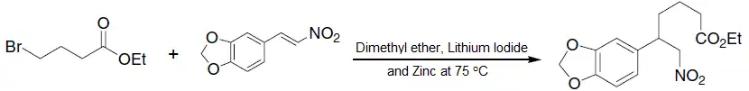 - A nitroalkene behaving as a Michael acceptor in the synthesis of Lycoricidine:[1][9]