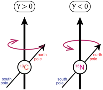 Unlike most nuclei, the gyromagnetic ratio for 15N is negative. With the spin precession phenomenon, the sign of γ determines the sense (clockwise vs counterclockwise) of precession. Most common nuclei have positive gyromagnetic ratios such as 1H and 13C.[3][4]
