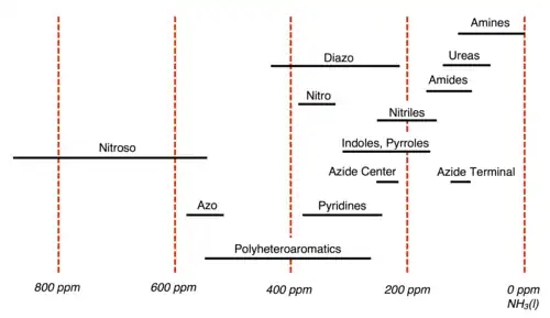 The International Union of Pure and Applied Chemistry (IUPAC) recommends using CH3NO2 as the experimental standard; however in practice many spectroscopists utilize pressurized NH3(l) instead. For 15N, chemical shifts referenced with NH3(l) are 380.5 ppm upfield from CH3NO2 (δNH3 = δCH3NO2 + 380.5 ppm). Chemical shifts for 15N are somewhat erratic but typically they span a range of -400 ppm to 1100 ppm with respect to CH3NO2. Below is a summary of 15N chemical shifts for common organic groups referenced with respect to NH3, whose chemical shift is assigned 0 ppm.[6][2]