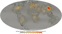 In May 2015, the National Green Tribunal directed Delhi and other states in India to ban diesel vehicles over 10 years old as a measure to reduce nitrogen dioxide emission that may result in nitrogen dioxide poisoning.[31] In 2008, the report of United Kingdom Committee on the Medical Effects of Air Pollutants (COMEAP) suggested that air pollution is the cause of about 29,000 deaths in UK.[32] The WHO urban air quality database estimated Delhi's mean annual PM 10 levels in 2010 as 286 μg /m3 and London as 23 μg /m3. In 2014, the database estimated Delhi's annual mean PM 2.5 particulate matter levels in 2013 as 156 μg /m3 whereas, London have only 8 μg /m3 in 2010 but the nitrogen dioxide in London breach the European Union's standard.[33] In 2013, the annual mean nitrogen dioxide level in London was estimated as 58 μg /m3 but the save and "threshold limit value" is 40 μg /m3.[34] In March 2015, Brussels took the United Kingdom into court for breaching emissions limits of nitrogen dioxide at its coal-fired Aberthaw power stations in Wales.[35] The plant operated under a permit allowing emissions of 1200 mg/Nm3, which is more than twice the 5 mg/Nm3 limit specified in the EU's large combustion plant directive.[36]