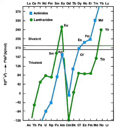 The lanthanides and actinides, in the metallic state, can exist as either divalent (such as europium and ytterbium) or trivalent (most other lanthanides) metals. The former have fns2 configurations, whereas the latter have fn−1d1s2 configurations. In 1975, Johansson and Rosengren examined the measured and predicted values for the cohesive energies (enthalpies of crystallization) of the metallic lanthanides and actinides, both as divalent and trivalent metals.[61][62] The conclusion was that the increased binding energy of the [Rn]5f136d17s2 configuration over the [Rn]5f147s2 configuration for nobelium was not enough to compensate for the energy needed to promote one 5f electron to 6d, as is true also for the very late actinides: thus einsteinium, fermium, mendelevium, and nobelium were expected to be divalent metals, although for nobelium this prediction has not yet been confirmed.[61] The increasing predominance of the divalent state well before the actinide series concludes is attributed to the relativistic stabilization of the 5f electrons, which increases with increasing atomic number: an effect of this is that nobelium is predominantly divalent instead of trivalent, unlike all the other lanthanides and actinides.[63] In 1986, nobelium metal was estimated to have an enthalpy of sublimation between 126 kJ/mol, a value close to the values for einsteinium, fermium, and mendelevium and supporting the theory that nobelium would form a divalent metal.[60] Like the other divalent late actinides (except the once again trivalent lawrencium), metallic nobelium should assume a face-centered cubic crystal structure.[2] Divalent nobelium metal should have a metallic radius of around 197 pm.[60] Nobelium's melting point has been predicted to be 800 °C, the same value as that estimated for the neighboring element mendelevium.[64] Its density is predicted to be around 9.9 ± 0.4 g/cm3.[2]