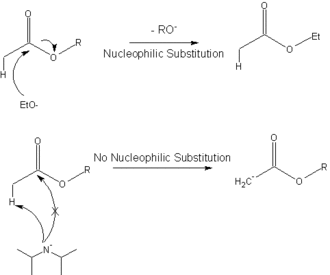 The following diagram shows how the hindered base, lithium diisopropylamide, is used to deprotonate an ester to give the enolate in the Claisen ester condensation, instead of undergoing a nucleophilic substitution.