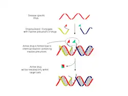 In 1999 Pavel Sergeev suggested the use of NATC to synthesize biologically active compounds within living organisms.,[1] including use within human cells. In this application, the precursors are distributed in the whole human body and the chemical reactions are performed only within cells having specific RNA molecules. This approach allows very specific synthesis within particular tissues or within specific cells of the tissue. It is especially a new tool to deliver medications to cancer cells. Additionally biologically active compounds could be delivered to specific cells within humans to promote the targeted cells to divisions. NATC also opens the possibility to treat bacterial diseases. Many scientific groups have performed NATC in vivo to visualize eukaryotic as well as bacterial cells. As a principle, it may be employed to treat oncological and bacterial diseases, as well as to visualize them.[2][3][4][5][6][7]