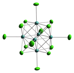 With metals in group 4 or 5 a so-called edge-capped octahedral clusters are more common. Twelve halides are located along the edge of the octahedron and six are terminal. Examples of this structure type are tungsten(III) chloride, Ta6Cl14(H2O)4,[5][6] Nb6F15, and Nb6F182−.[1]