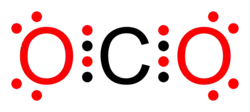 The valence electrons can be counted using a Lewis electron dot diagram as shown at the right for carbon dioxide. The electrons shared by the two atoms in a covalent bond are counted twice, once for each atom. In carbon dioxide each oxygen shares four electrons with the central carbon, two (shown in red) from the oxygen itself and two (shown in black) from the carbon. All four of these electrons are counted in both the carbon octet and the oxygen octet, so that both atoms are considered to obey the octet rule.