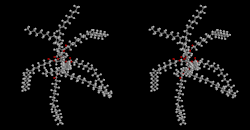 ![]() Top: Generic 2D structure of olestra, where R = H or fatty acid group, C(O)CnHm Bottom: Stereoscopic animation of a representative olestra molecule with 8 unsaturated fatty acid groups | |