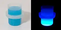 Brighteners are used in many papers, especially high brightness papers, resulting in their strongly fluorescent appearance under UV illumination. Paper brightness is typically measured at 457 nm, well within the fluorescent activity range of brighteners.[5] Paper used for banknotes does not contain optical brighteners, so a common method for detecting counterfeit notes is to check for fluorescence.