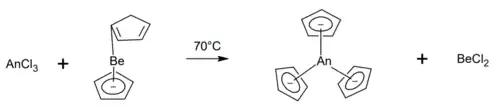 The synthesis of the AnCp3 usually follows the reaction scheme shown above[4][14] with a few more added steps that are sometimes needed to synthesize the trichlorides from the commercially supplied oxides.[13] Nevertheless, other syntheses are also used by some authors: alkali metal cyclopentadienides can be used instead of the beryllium complex, and An(IV) complexes can also be used via a reductive elimination reaction.
