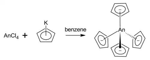 Tetravalent thorium, uranium and neptunium easily form MCp4 compounds by a metathesis reaction from potassium cyclopentadienide using benzene as a solvent.[4]