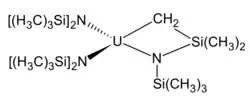 Uranium and thorium both form metallacycles with a diverse chemistry.[4] These complexes are very labile so trimethylsilyl groups are again present for protection. These compounds are formed by reacting weaker alkylating agents (LiCH3 and Mg(CH3)2 are too strong and lead to the formation of simple alkyls) with ClAn[N(Si(CH3)2]3 (An = Th, U).