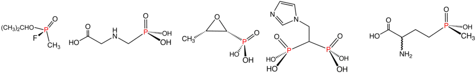 Illustrative examples of phosphonates and phosphinates in the order shown: Sarin (phosphonate), Glyphosate (phosphonate), fosfomycin (phosphonate), zoledronic acid (phosphonate), and Glufosinate (phosphinate). In aqueous solution, phosphonic acids ionize to give the corresponding organophosphonates.