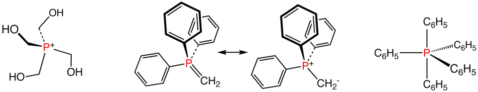 Illustrative phosphorus(V) compounds: the phosphonium ion P(CH2OH)4+, two resonance structures for the Wittig reagent Ph3PCH2, and pentaphenylphosphorane, a rare pentaorganophophorus compound.