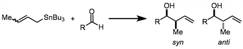 Three modes allow the addition of allylstannanes to carbonyls: thermal addition, Lewis-acid-promoted addition, and addition involving prior transmetalation. Each of these modes invokes a unique model for stereocontrol, but in all cases, a distinction is made between reagent and substrate control. Substrate-controlled additions typically involve chiral aldehydes or imines and invoke the Felkin-Anh model. When all reagents are achiral, only simple diastereoselectivity (syn versus anti, see above) must be considered. Addition takes place via an SE' mechanism involving concerted dissociation of tin and C-C bond formation at the γ position.