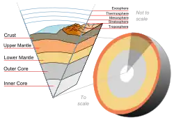 • top: a diamond cuboctahedron in materials science and diagram of the structure of the Earth including its atmosphere in Earth sciences