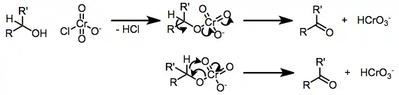 Chromate esters are implicated in these reactions. The chromate ester decomposes to the aldehyde or carbonyl by transfer of an alpha proton. Large kinetic isotope effects (kH/kD) are observed.[1]