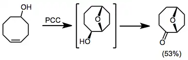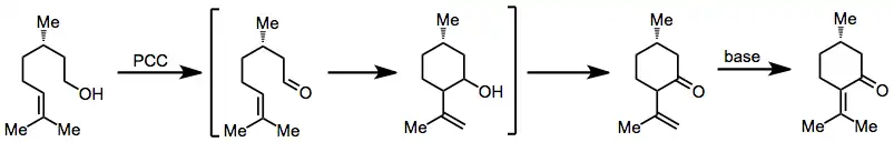 Oxidative annulation of alkenols to form six-membered rings may be accomplished with PCC. This process is postulated to occur via initial oxidation of the alcohol, attack of the alkene on the new carbonyl, then re-oxidation to a ketone. Double-bond isomerization may occur upon treatment with base as shown below.[1]