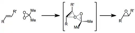Oxidation with dioxiranes refers to the introduction of oxygen into organic substrates using dioxiranes. Dioxiranes are well known for epoxidations (synthesis of epoxides from alkenes).[1] Dioxiranes oxidize other unsaturated functionality, heteroatoms, and alkane C-H bonds.[2] Dioxiranes are metal-free oxidants.