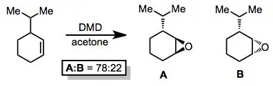Diastereoselective epoxidation may be achieved through the use of alkene starting materials with diastereotopic faces. When racemic 3-isopropylcyclohexene was subjected to DMD oxidation, the trans epoxide, which resulted from attack on the less hindered face of the double bond, was the major product.[1]