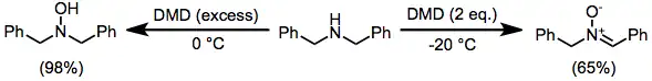 DMD may oxidize heteroatoms to the corresponding oxides (or products of oxide decomposition). Often, the results of these oxidations depend on reaction conditions. Tertiary amines cleanly give the corresponding N-oxides.[2] Primary amines give nitroalkanes upon treatment with 4 equivalents of DMD, but azoxy compounds upon treatment with only 2 equivalents.[2] Secondary amines afford either hydroxylamines or nitrones.[2]