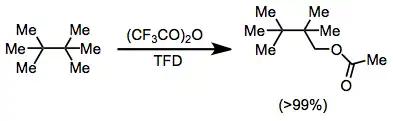 Although alkanes are typically difficult to functionalize directly, C-H insertion with TFD is an efficient process in many cases. The order of reactivity of C-H bonds is: allylic > benzylic > tertiary > secondary > primary. Often, the intermediate alcohols produced are oxidized further to carbonyl compounds, although this can be prevented by trapping in situ with an anhydride. Chiral alkanes are functionalized with retention of configuration.[2]