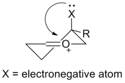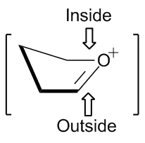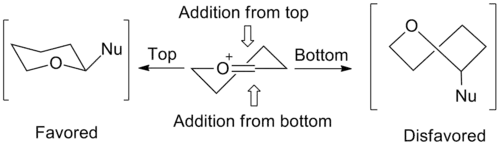 In an alkene ring that does not contain an oxygen atom, any large substituent prefers to be in an equatorial position, in order to minimize steric effects. It has been observed in rings containing oxocarbenium ions that electronegative substituents prefer the axial or pseudo-axial positions. When the electronegative atom is in the axial position, its electron density can be donated through space to the positively charged oxygen atom in the ring.[5] This electronic interaction stabilizes the axial conformation. Hydroxyl groups, ethers and halogens are examples of substituents that exhibit this phenomenon. Stereoelectronic effects must be taken into consideration when determining the lowest energy conformation in the analysis for nucleophilic addition to an oxocarbenium ion.[4][6]