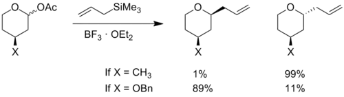 - 1 2 Romero, J. A. C.; Tabacco, S. A.; Woerpel, K. A. (1999), "Stereochemical Reversal of Nucleophilic Substitution Reactions Depending upon Substituent: Reactions of Heteroatom-Substituted Six-Membered-Ring Oxocarbenium Ions through Pseudoaxial Conformers", Journal of the American Chemical Society, 122: 168–169, doi:10.1021/ja993366o