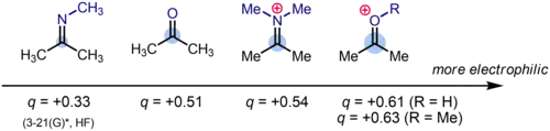 Numerically, a typical partial charge (derived from Hartree-Fock computations) for the carbonyl carbon of a ketone R2C=O (like acetone) is δ+ = 0.51. With the addition of an acidic hydrogen to the oxygen atom to produce [R2C=OH]+, the partial charge increases to δ+ = 0.61. In comparison, the nitrogen analogues of ketones and oxocarbenium ions, imines (R2C=NR) and iminium ions ([R2C=NRH]+), respectively, have partial charges of δ+ = 0.33 and δ+ = 0.54, respectively. The order of partial positive charge on the carbonyl carbon is therefore imine < ketone < iminium < oxocarbenium.