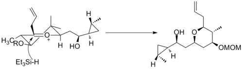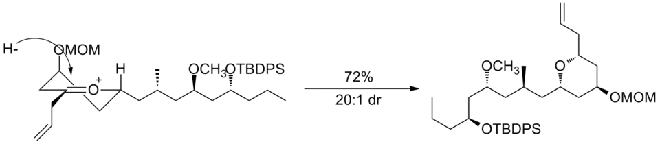 A second example is seen in the key step of the synthesis of (−)-neopeltolide, which uses another six-membered oxocarbenium ring reduction for a diastereoselective hydride addition.[12]