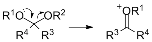 Formation of oxocarbenium ions can proceed through several different pathways. Most commonly, the oxygen of a ketone will bind to a Lewis Acid, which activates the ketone, making it a more effective electrophile. The Lewis acid can be a wide range of molecules, from a simple hydrogen atom to metal complexes. The remainder of this article will focus on alkyl oxocarbenium ions, however, where the atom added to the oxygen is a carbon. One way that this sort of ion will form is the elimination of a leaving group. In carbohydrate chemistry, this leaving group is often an ether or ester. An alternative to elimination is direct deprotonation of the molecule to form the ion, however, this can be difficult and require strong bases to achieve.