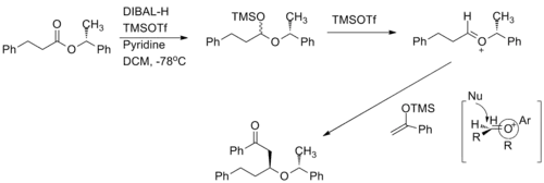 Chiral oxocarbenium ions have been exploited to carry out highly diastereoselective and enantioselective acetate aldol addition reactions.[10] The oxocarbenium ion is used as an electrophile in the reaction. When the methyl group increases in size, the diastereoselevtivity increases.