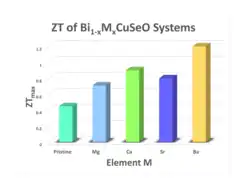 In 2010, p-type polycrystalline BiCuSeO oxyselenides were reported as possible thermoelectric materials.[12] The weak bonds between the [Cu2Se2]−2 conducting and [Bi2O2]+2 insulating layer, as well as the anharmonic crystal lattice structure, may account for the substance's low thermal conductivity and high thermoelectric performance. Recently, BiCuSeO's ZT value, a dimensionless figure-of-merit indicating thermoelectric performance, has been increased from 0.5 to 1.4. Experiment has shown that Ca doping can improve electrical conductivity, thereby increasing the ZT value.[1] Additionally, replacing 15% of the Bi3+ ions with group 2 metal ions, Ca2+, Sr2+, or Ba2+ (Figure 4), also optimizes the charge carrier concentration.[12]