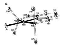 In most cases the MPOCOP center features a planar MC3O2P2 core. The rigid conformation and square planar geometry of the POCOP ligand allow for systematic changes over the steric and electronic environment at the metal center.[2] The geometry of metal compounds formed with POCOP ligands can be seen through the P-Ni-P (164.01 Å ) and C-Ni-Cl (178.31Å) bond angles found for (POCOP)NiCl. The bond angles of this compound are representative of angles found for several other pocop metal compounds.[4] Because of relatively small P-Ni-P bond angle the otherwise Ni complexes exhibit a slight tetrahedral distortion.