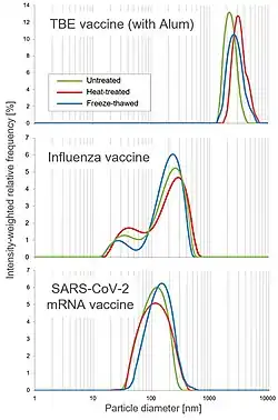 DLS is a particularly appreciated technique for the characterization of nanoparticles designed for drug delivery, such as vaccines. DLS instruments are for instance part of the quality control process for mRNA vaccines formulated in lipid nanoparticle carriers.[22]