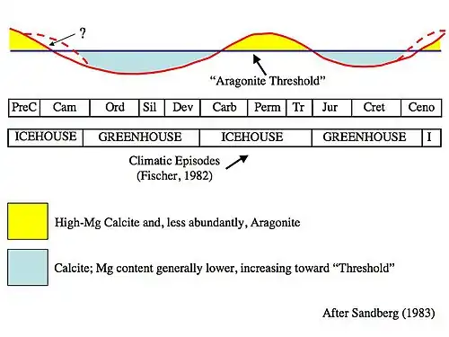 The Early Paleozoic and the Middle to Late Mesozoic oceans were predominantly calcite seas, whereas the Middle Paleozoic through the Early Mesozoic and the Cenozoic (including today) are characterized by aragonite seas.[21][22][23][24][25][26][27][28]