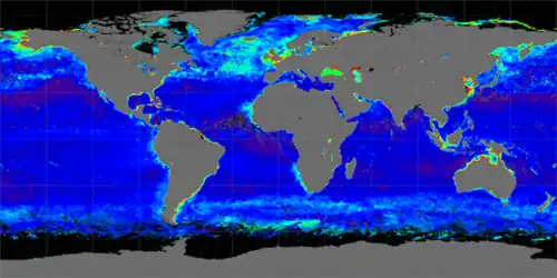 Material was copied from this source, which is available under a Creative Commons Attribution 4.0 International License. - ↑ Mitchell, C.; Hu, C.; Bowler, B.; Drapeau, D.; Balch, W. M. (2017). "Estimating Particulate Inorganic Carbon Concentrations of the Global Ocean from Ocean Color Measurements Using a Reflectance Difference Approach". Journal of Geophysical Research: Oceans. 122 (11): 8707–8720. Bibcode:2017JGRC..122.8707M. doi:10.1002/2017JC013146.