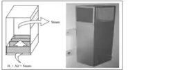 A recombiner is a box that is open from the bottom and from the top. The catalyst is located at the lower part of the box. The reaction of hydrogen and oxygen on the catalyst surface generates heat, and temperature in the recombiner reaches hundreds of degrees Celsius. Hot steam is lighter than the air in the containment, so buoyancy is caused inside the recombiner, much like in a chimney. This causes a strong airflow through the recombiner, feeding hydrogen and oxygen from the containment to the device.[1]