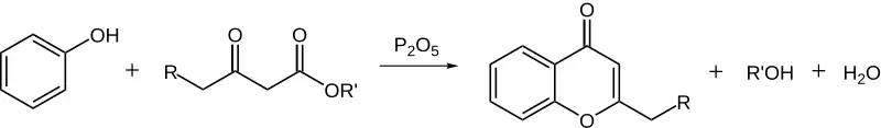 In a variation the reaction of phenols and beta-ketoesters and phosphorus pentoxide yields a chromone. This reaction is called Simonis chromone cyclization.[6][7] The ketone in the ketoester is activated by P2O5 for reaction with the phenol hydroxyl group first, the ester group in it is then activated for electrophilic attack of the arene.