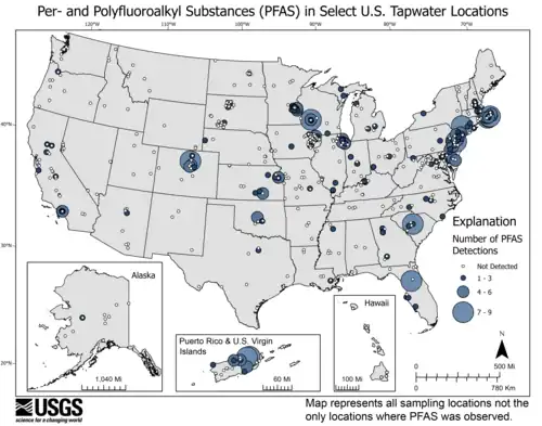 Based on tap water studies from 716 locations from 2016 and 2021, the U.S. Geological Survey (USGS) found that the PFAS levels exceeded the EPA advisories in approximately 75% of the samples from urban areas and in approximately 25% of the rural area samples.[132]