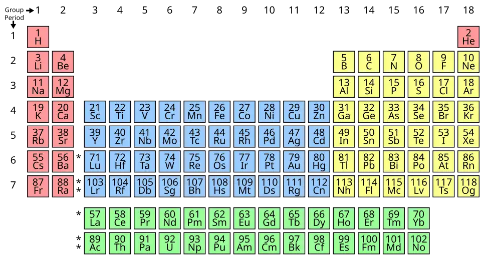 There are currently seven complete periods in the periodic table, comprising the 118 known elements. Any new elements will be placed into an eighth period; see extended periodic table. The elements are colour-coded below by their block: red for the s-block, yellow for the p-block, blue for the d-block, and green for the f-block.