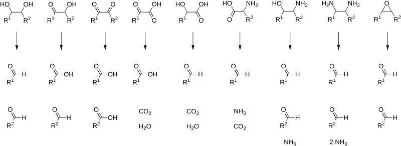 Periodates can cleave carbon–carbon bonds on a variety of 1,2-difunctionalised alkanes.[13][14] The most common example of this is diol cleavage, which was also the first to be discovered (Malaprade reaction).[15] In addition to diols, periodates can cleave 1,2-hydroxy ketones, 1,2-diketones, α-keto acids, α-hydroxy acids, amino acids,[16] 1,2-amino alcohols,[17] and 1,2-diamines,[18] to give aldehydes, ketones, and carboxylic acids. In the presence of strong acid catalyst, like H2SO4 or HNO3 epoxides[19][20] are also converted into aldehyde or ketones or dicarbonyl compounds.