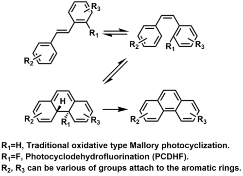 Phenanthrene can also be obtained photochemically from certain diarylethenes (Mallory reaction):
