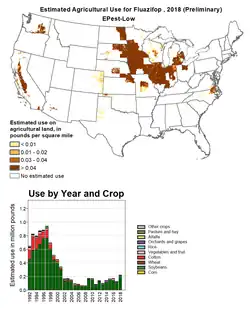 - ↑ US Geological Survey (2021-10-12). "Estimated Agricultural Use for Fluazifop, 2018". Retrieved 2021-12-27.